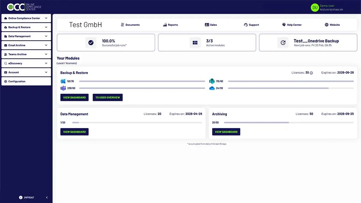 The Online Compliance Center has been expanded functionally and visually with versions 3.1 and 3.1.1. New dashboards, expanded reporting and audit functions, and improvements in the backup and restore area ensure greater transparency and security. Details can be found in the Help Center.