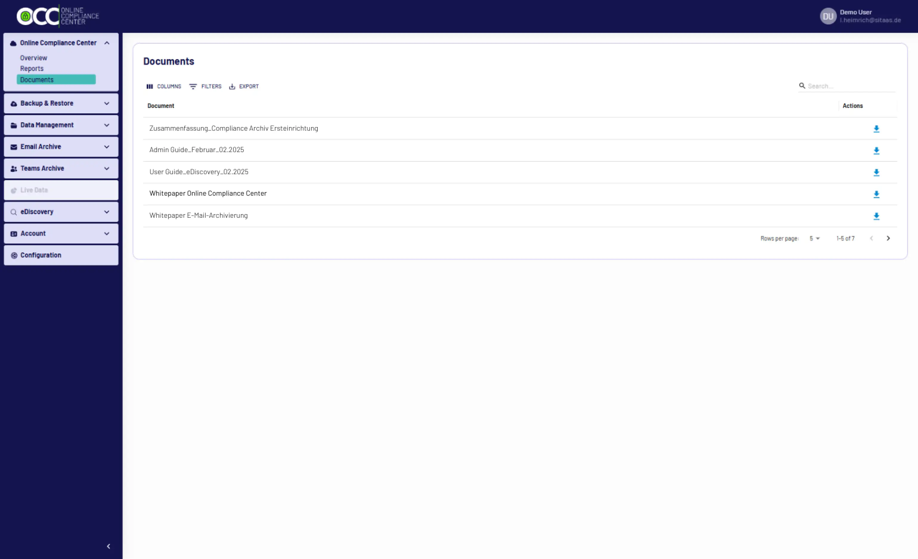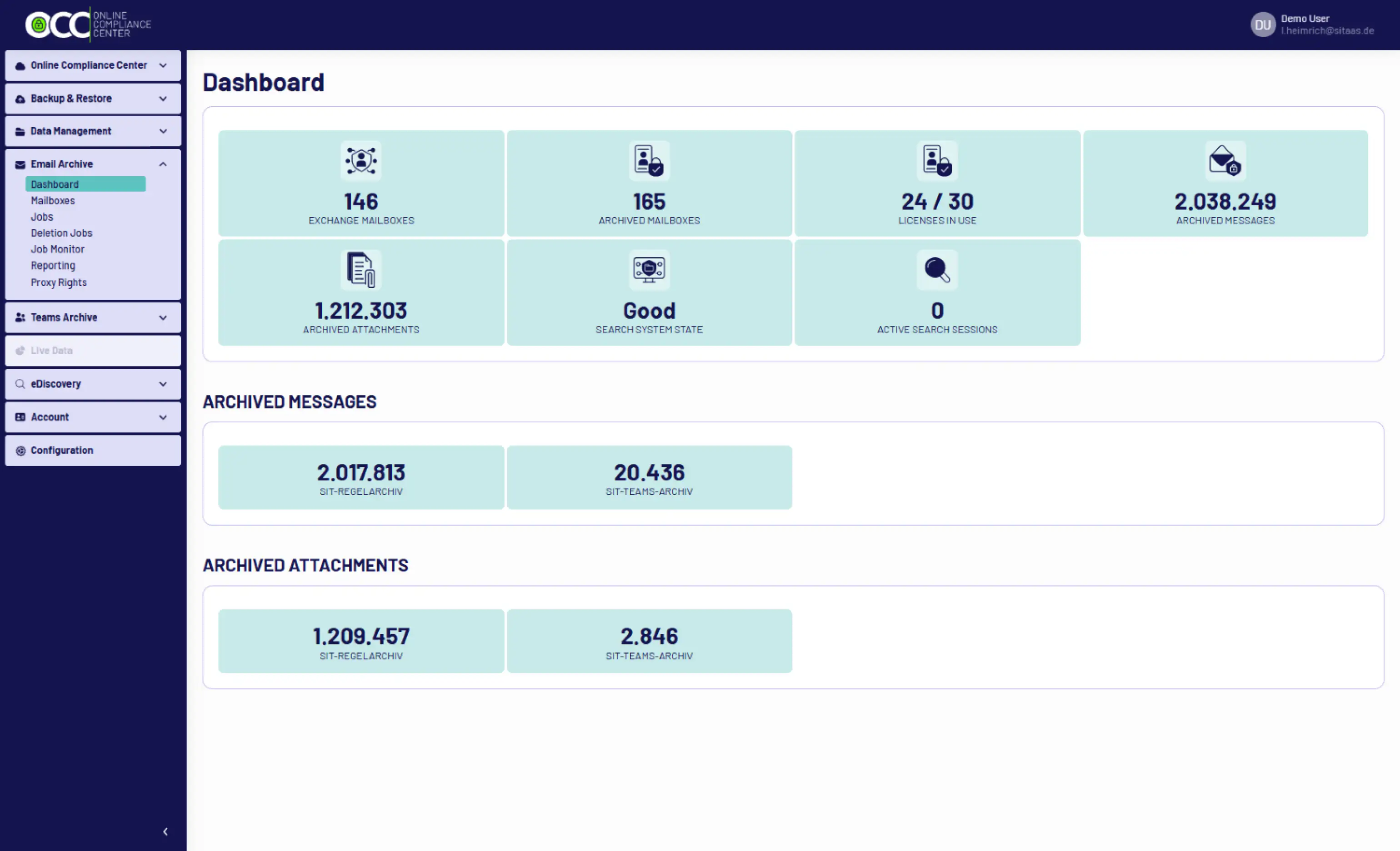 Klicken Sie auf Dashboard, um einen Überblick zu Ihrem individuellen Compliance Archiv zu erhalten.